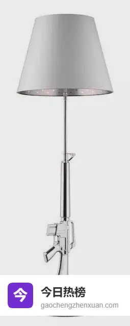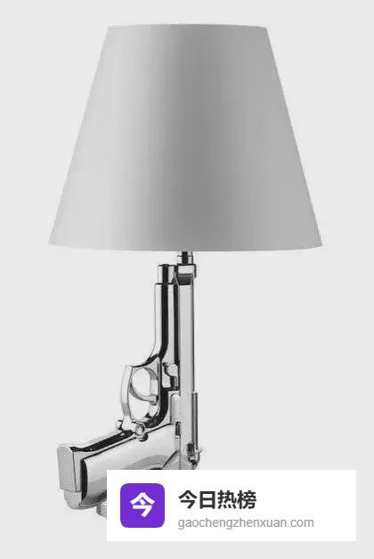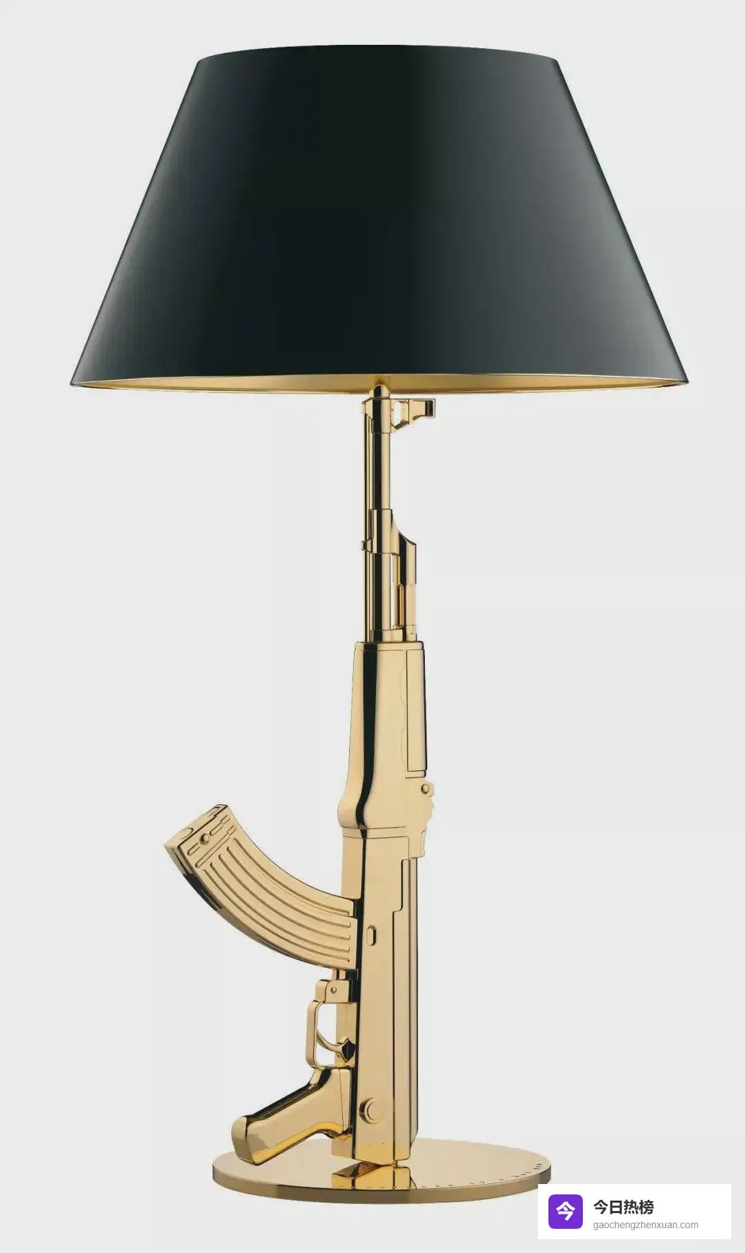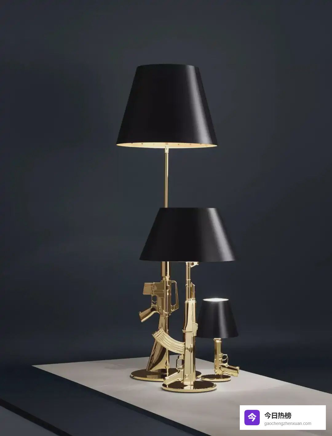 2005 年,法国设计师 Philippe Starck 推出 “枪支系列” 灯具:Bedside Gun、Table Gun、Lounge Gun 三款,分别以贝瑞塔、AK47、M16 为原型,金色与铬合金双面呈现。看似冷酷的金属外壳,却在灯罩内部刻上十字架,用光去对抗黑暗,金色部分则象征贪婪与经济利益,把战争的罪恶与金钱的腥臭一并曝光。