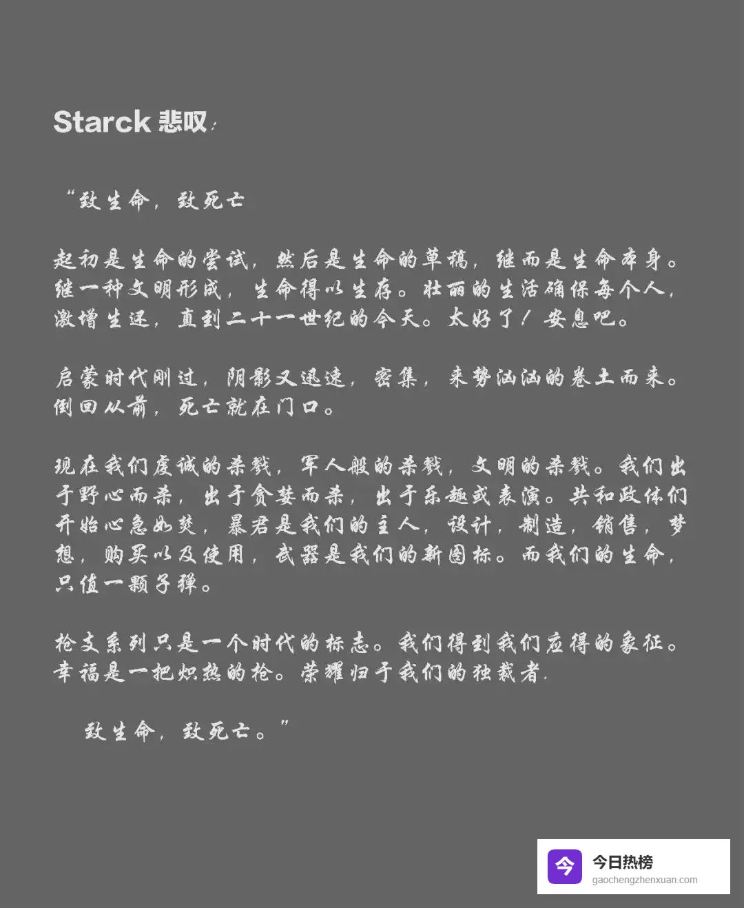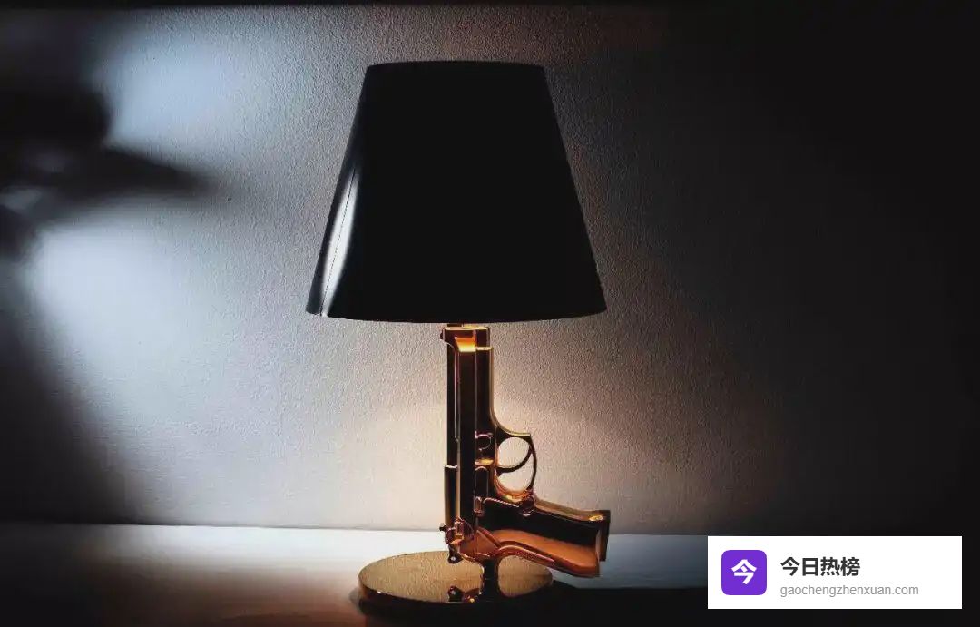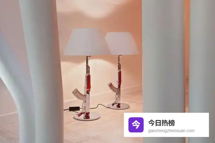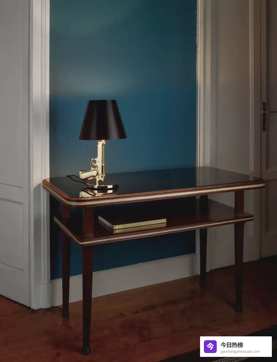 2005 年,法国设计师 Philippe Starck 推出 “枪支系列” 灯具:Bedside Gun、Table Gun、Lounge Gun 三款,分别以贝瑞塔、AK47、M16 为原型,金色与铬合金双面呈现。看似冷酷的金属外壳,却在灯罩内部刻上十字架,用光去对抗黑暗,金色部分则象征贪婪与经济利益,把战争的罪恶与金钱的腥臭一并曝光。