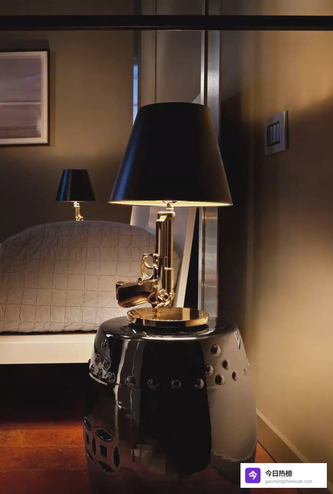 金属拉丝的枪身缩短成床头夹角,夜灯不再只是陪伴,更是对和平的警醒。
