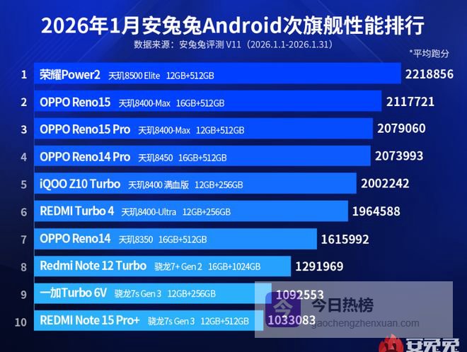 在智能手机市场的大浪淘沙中,能让人一眼记住的产品并不多,但荣耀Power2绝对是个例外。就在安兔兔刚刚公布的2026年1月安卓次旗舰性能榜单上,这款手机以绝对优势杀出重围,稳坐第一把交椅,更令人咋舌的是,它还顶着“国内主流手机电池容量天花板”的头衔。当“性能冠军”与“续航怪兽”这两个标签同时出现在一台机器上时,我们不仅看到了一款产品的硬实力,更看到了荣耀对中端市场的降维打击。