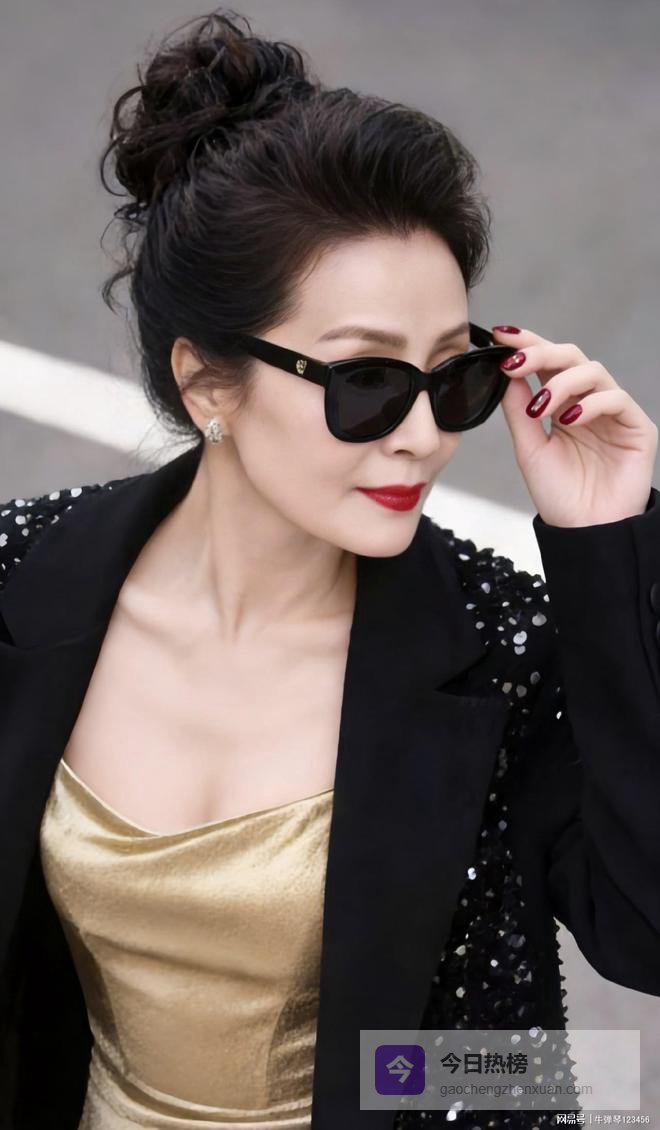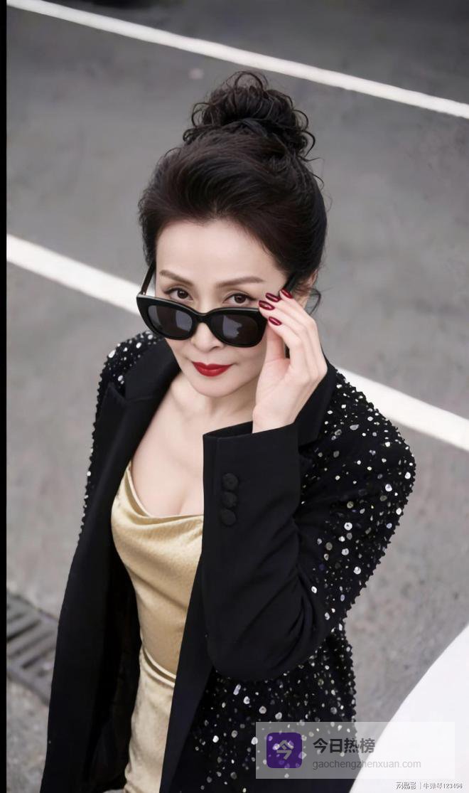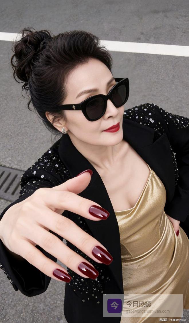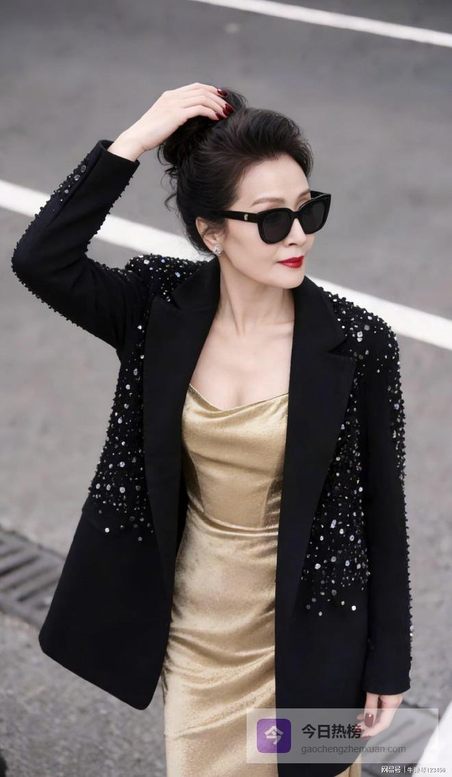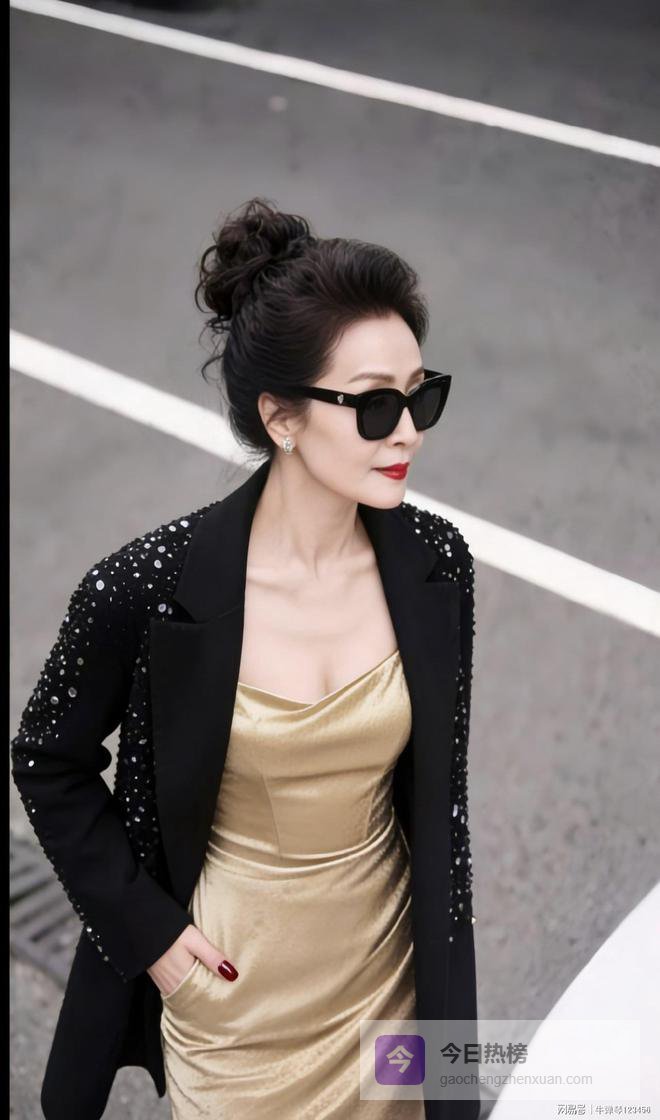 版型也不是紧巴巴的,有点宽松,正好把里面那条金裙子耀眼的光泽给“压”住了一点.再瞅瞅细节,黑色盘发一丝不乱,猫眼墨镜一戴,酒红色的长指甲,配上正红色口红,加上耳朵上耳钉一闪一闪.这感觉怎么说呢?