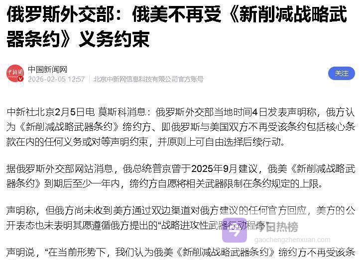 需要了解的是,自2019年《中导条约》终止以来,现存的《新削减战略武器条约》已成为俄美之间唯一覆盖核武的协定,堪称全球核安全的“最后一道屏障”。
