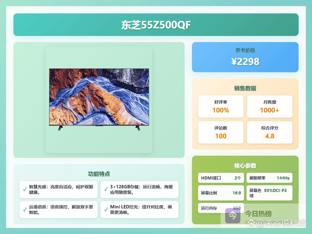 四、东芝这款东芝55Z500QF采用高分区Mini LED控光技术,实现更精准的背光管理,让画面对比更明显,细节表现得更加丰富自然。无明显光晕,暗部细节保持清晰,提升整体画质体验,尤其适合喜欢看高质量影视内容的用户。