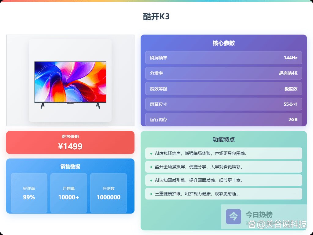 三、酷开酷开K3配备了144Hz高刷新率,特别适合喜欢追剧、玩游戏的用户。即使在HDMI输入下,也能保持画面流畅不卡顿,让运动和快速切换的场景更加自然顺滑,体验更真实。