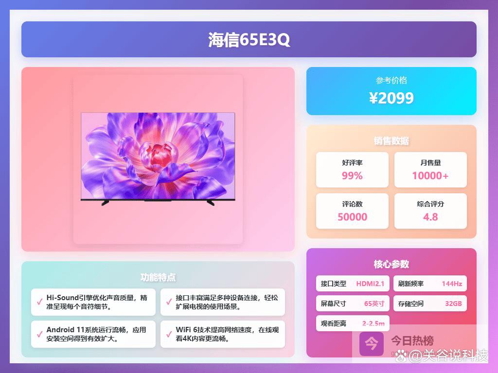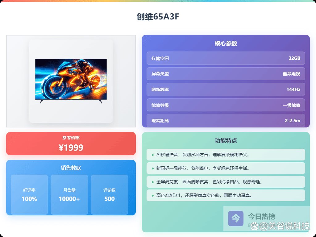 哪个品牌2000元内电视机好,值得入手高性价比型号推荐一、创维拥有144Hz高刷新率,这款创维65A3F可以带来更流畅的画面表现。不论是高速运动的游戏画面,还是动作片的快速切换,都能减少拖影和模糊,让视野更加顺滑自然。对于喜欢玩游戏或看动作大片的用户来说,这个效果挺实在的。