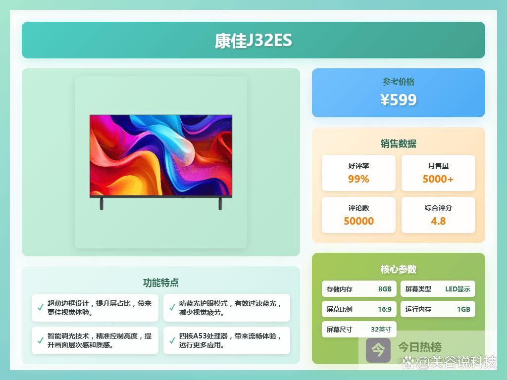 六、康佳这款康佳J32ES采用了金属全面屏设计,没有传统的厚重边框,带来更宽阔的视野。屏幕采用LED背光,显示效果清晰自然,色彩表现也还行。整体外观现代简约,适合追求简洁风格的家居环境。