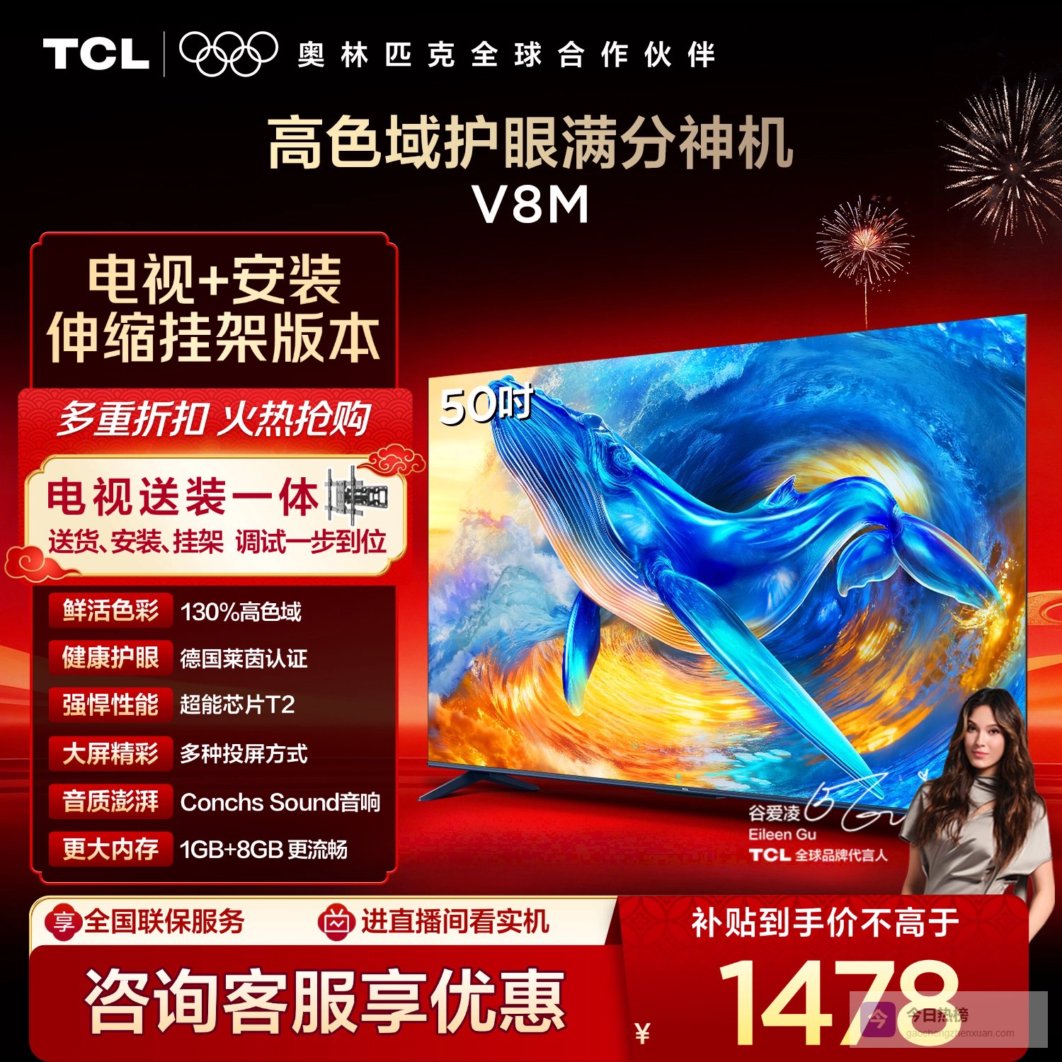 TCL 50V8M 包安装版【伸缩挂架送装一体】50英寸 高色域护眼电视 V8M 护眼¥
