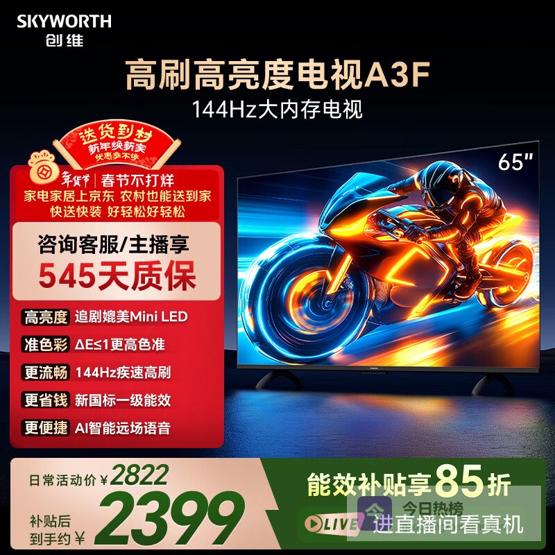 创维电视A3F 65英寸 144Hz疾速高刷 2+64GB大内存 4K超高清 一级能效 国家补贴¥