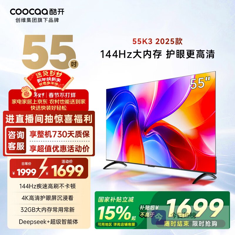 酷开经济款 创维K3 2025款 55英寸 智慧屏 32GB 144Hz 远场语音 一级能效 国家补贴 液晶电视机55P3F-J¥