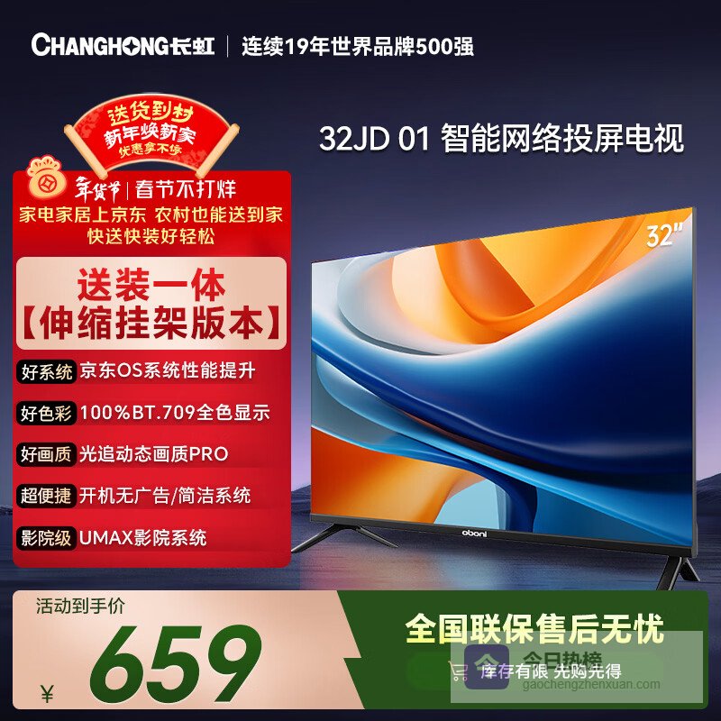 长虹经济款 长虹欧宝丽京东联名款 京东OS 32JD 01 32英寸【伸缩挂架版】无开机广告 智能电视 32Z60H¥