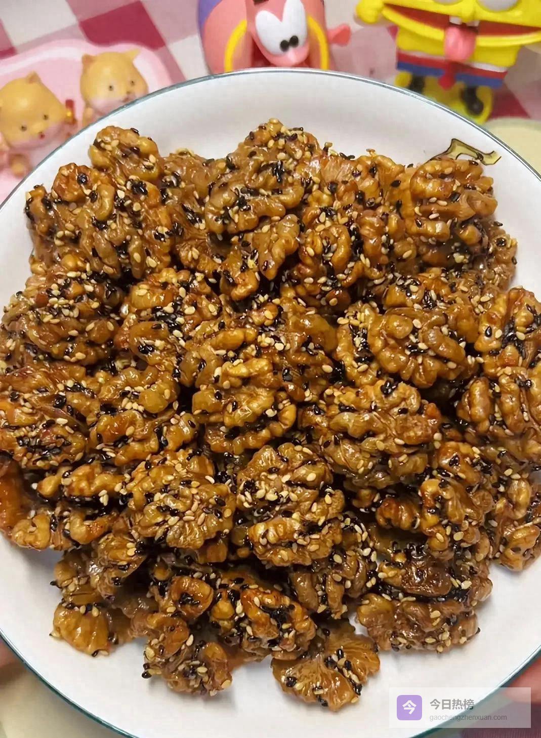 琥珀核桃是一款经典的食疗小点。 将核桃仁在烤箱中轻烤至香脆,再用少量蜂蜜和清水熬煮至粘稠,快速裹上核桃仁后晾凉。 这样做不仅改善了核桃的涩味,蜂蜜的滋润属性还能中和核桃的温燥,更适合阴虚体质的人适量食用。