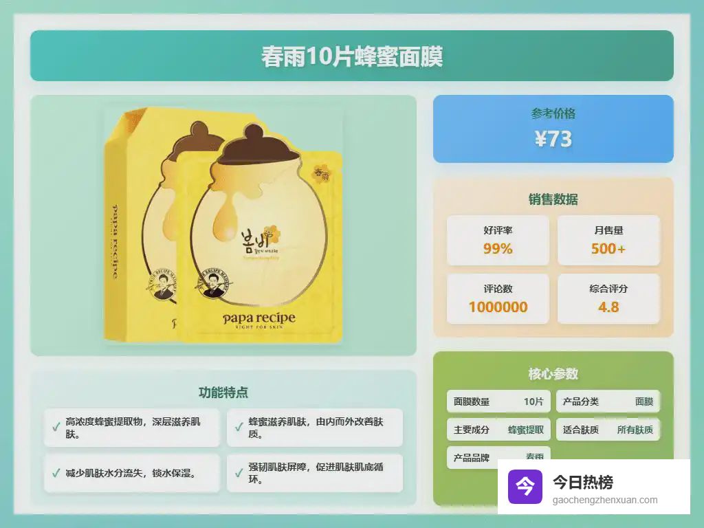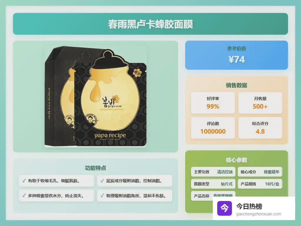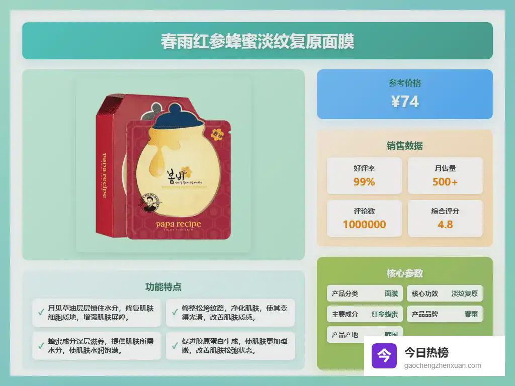 这款面膜含有丰富的蜂蜜和蜂胶提取物,能深层滋养肌肤,为肌肤提供充足的水分和养分,让干燥粗糙的肌肤变得更加细腻光滑。内含红参萃取物,能提升肌肤活力,帮助改善暗沉和肤色不均,让面色更加红润透亮。