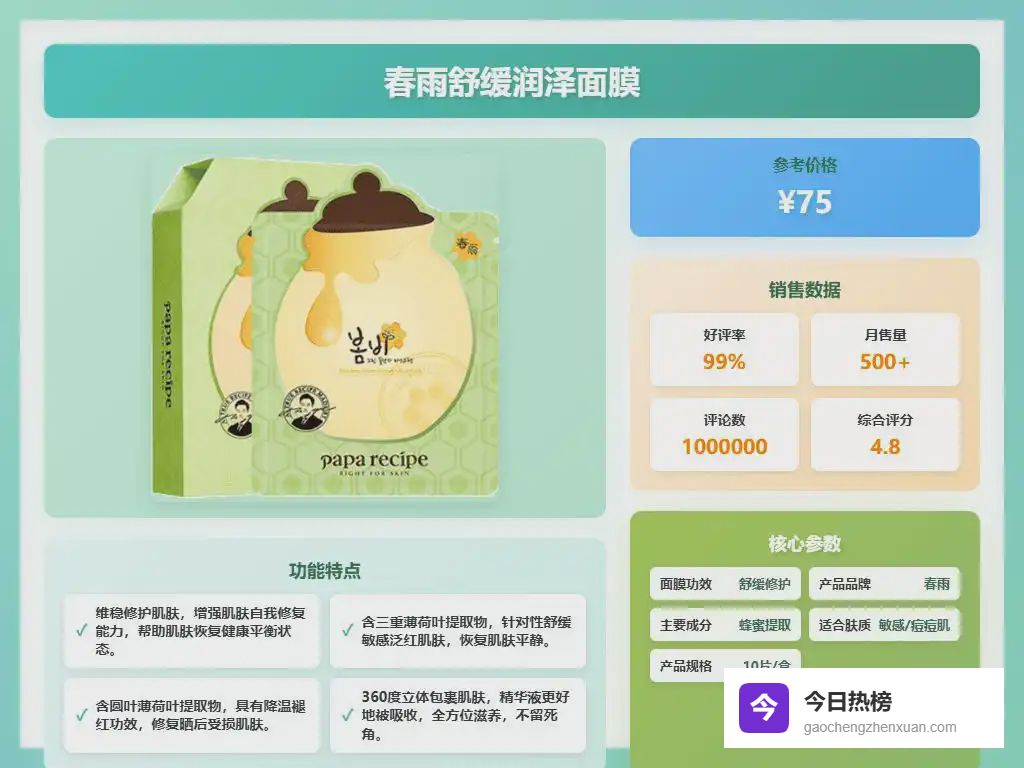 说实话,面膜这东西,甲之蜜糖乙之砒霜,得自己试了才知道好不好用。像我这种混合偏干的肤质,就比较注重补水和舒缓,有时候熬夜脸色不好,还会用提拉紧致的。 毕竟咱也不能让地心引力太放肆不是? 综合考量了成分、肤感、效果和价格,我整理了5款据说口碑还不错的春雨面膜,也算是“精选五款热门春雨面膜测评” 吧! 接下来就给大家挑了这几款,感兴趣的可以了解下。