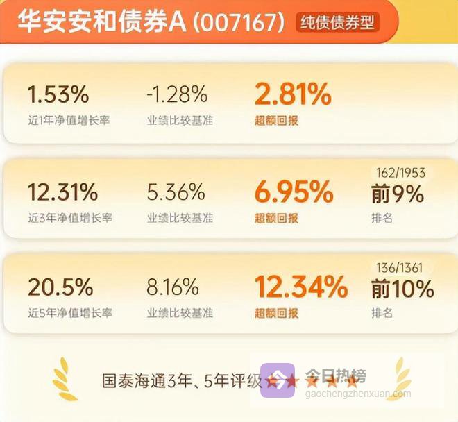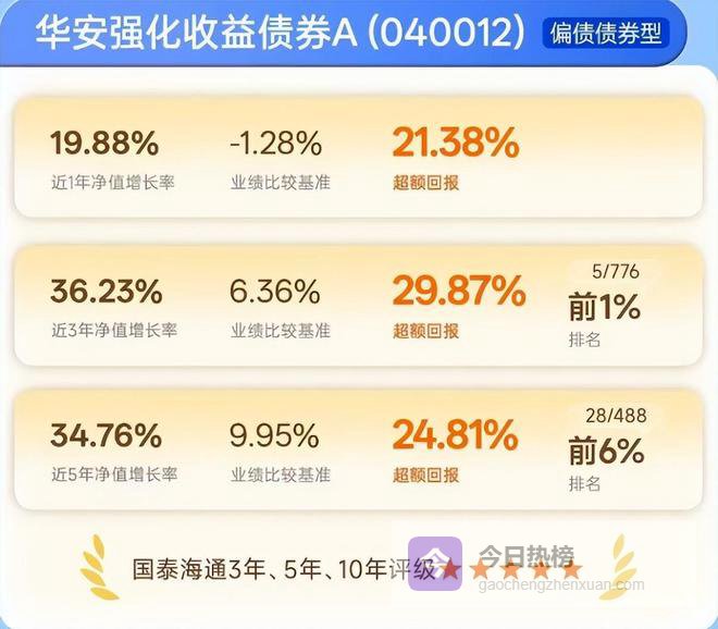 表现最突出的,是华安强化收益债券:近三年累计回报36.23%,在同类产品中排名前1%,并包揽三年期、五年期、十年期全五星评级。追其原因,2025年四季度,基金经理郑伟山聚焦利率债与高评级信用债,准确把握了经济数据边际变化与市场情绪转折,通过精选个券与灵活交易最终创造了显著超额收益。