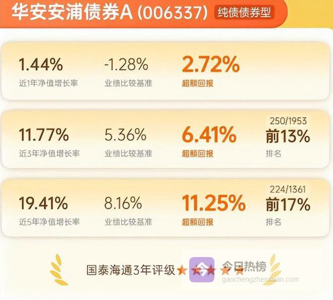 截至2025年12月31日,华安安浦债券A,近三年净值增长11.77%,大幅跑赢基准,在纯债基金中位列前13%,荣获三年期与五年期双五星评级。追其原因,2025年四季度该基金通过灵活调节久期与杠杆,重点布局高等级信用债,并结合期限利差、品种利差持续优化组合,在曲线上寻找交易机会。