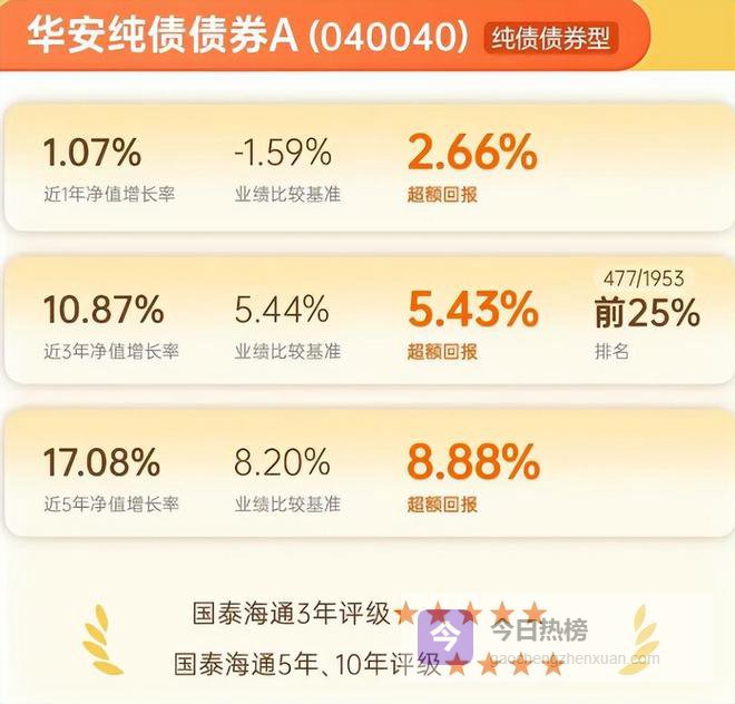 截至2025年12月31日,同样以纯债策略为主的华安纯债债券,近三年收益率10.87%,获国泰海通三年期五星评级。追其原因,该基金2025年四季度把握了长久期信用债、利率债及地方债的交易性机会,并在股市回暖后适时减持超长利率债,体现出灵活应变的能力。