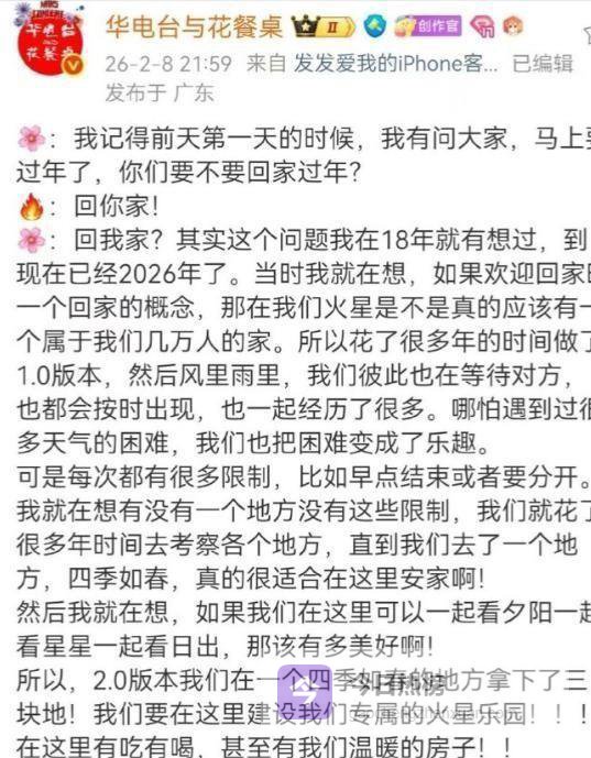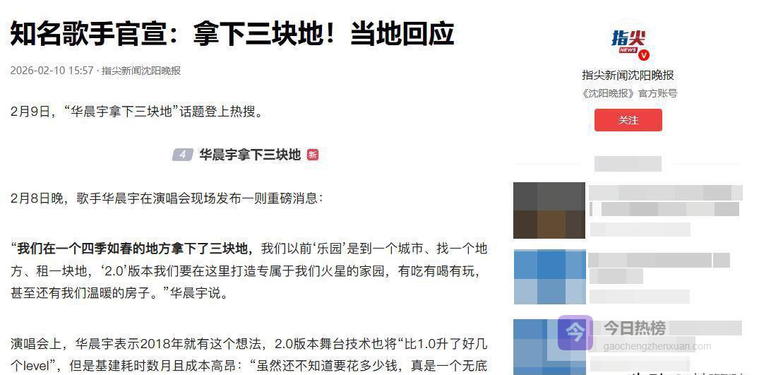 华晨宇买下的三块地2月8日晚,深圳的夜空被“火星演唱会”的耀眼灯光点亮,仿佛被划破。在台下粉丝们热情地挥舞着荧光棒、沉醉在浓厚的氛围中时,舞台上的华晨宇突然带来了一条令人震惊的消息。