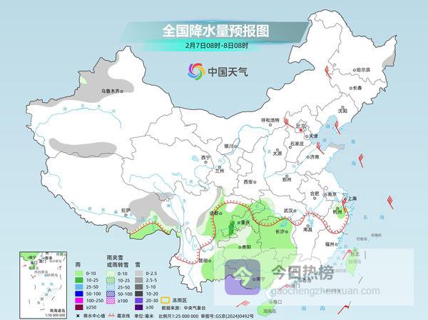 明天,本轮雨雪过程进入尾声,降水范围明显缩小,仅西南地区东部到江南西部一线仍有分散性小雨或雨夹雪。新疆沿天山地区和南疆盆地、西藏东南部、青海南部、川西高原、贵州北部等地有小雪或雨夹雪;西藏东南部、江南西部、西南地区东部和南部、华南大部及台湾岛等地有小雨,其中四川盆地东南部局地有中雨。