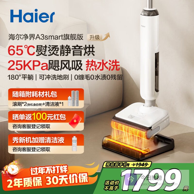 【品牌直营】海尔A3洗地机【23KPa吸力95℃洗烘0缠毛IPX7浸泡洗平躺】三贴边智能家用吸拖洗一¥