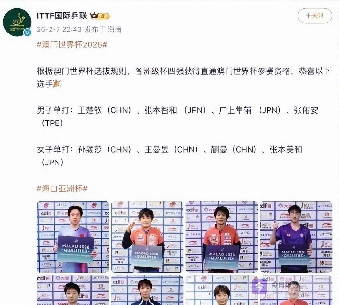 2026澳门单打世界杯已锁定42位参赛选手,国乒目前5人在列、张本兄妹齐入围,剩余6个席位将根据2月17日公布的世界排名补齐