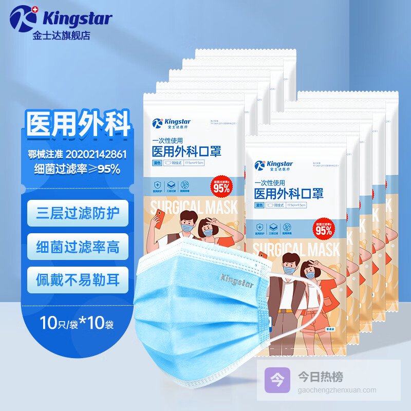 金士达一次性医用口罩非灭菌级3层防护过滤细菌医疗男女成人口罩 成人医用外科10只/袋*10袋 共100只 外科口罩¥