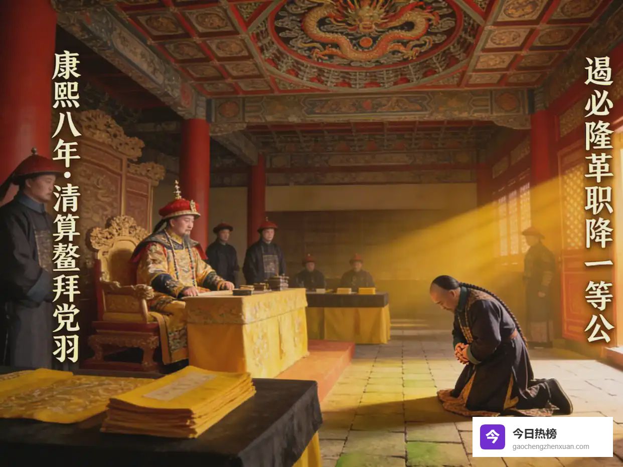 康熙八年,康熙除掉鳌拜后,开始清算鳌拜的党羽。遏必隆因为曾经附和鳌拜,被康熙革去了辅臣的职务,降为一等公。但康熙念在他是开国功臣的后代,而且没有主动作恶,所以并没有处死他,只是让他在家反省。