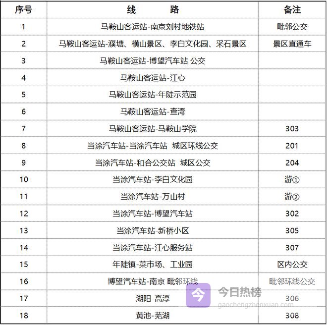 游1路、游2路、当涂至博望302路、马鞍山学院专线303路、经开区专线305路、当涂至江心307路、当涂至石桥601路、当涂至新丰602路、当涂至湖阳606路、当涂至大陇701路、当涂至太白工业集中区801路、当涂至乌溪802路、当涂至塘南805路、当涂至黄池808路