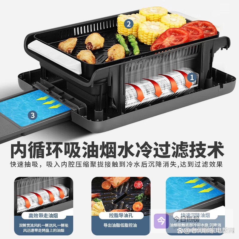 2. _高效净烟_:这个电烤锅可是有内置的吸油烟系统,能快速抽吸油烟,让厨房保持干净清爽。而且它还有内循环吸烟功能,油烟接触冷水后会沉降消失,简直就像有个隐形清洁工在厨房里工作。