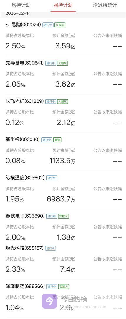 与此同时,超过13家上市公司在2月13日晚间扎堆发布了股东减持计划,其中包括股价年内涨了6倍多的炬光科技、连续两年亏损的高测股份,以及股价从高位跌去91%的ST易购。