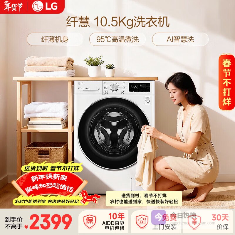 【京东自营】LG纤慧10.5KG全自动滚筒洗衣机超薄家用大容量AI直驱变频95°高温煮洗FLX10N¥