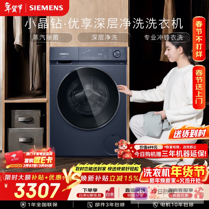 【京东自营】西门子小晶钻优享10KG大容量全自动滚筒洗衣机深层净洗蒸汽除菌冲锋衣洗隐形触控WG52H¥