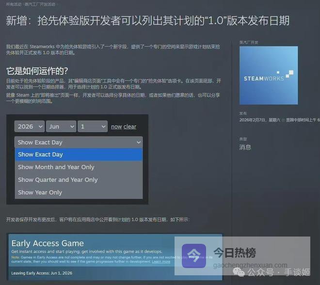 在2026年2月9日,Steam方终于公布了新功能:当抢先体验功能上线以后,制作方终于可以选择在显示抢先体验标签的同时,发布确切的发售时间了。