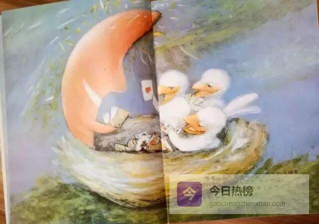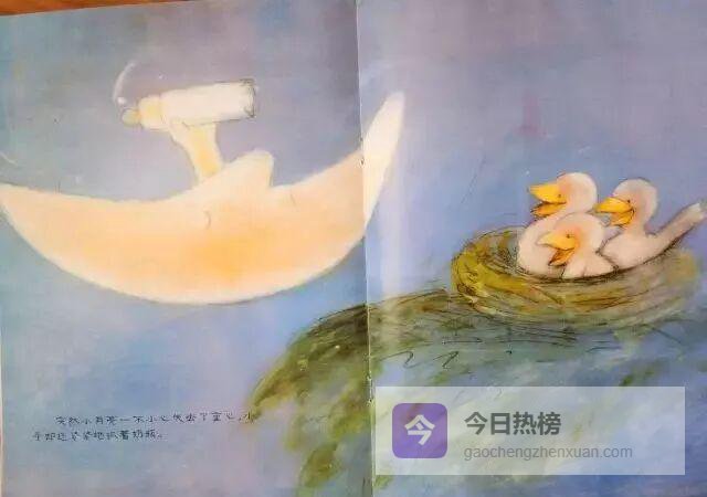 小月亮被鸟儿们小心翼翼地搬动,飞上了很高、很高的天空,三个宝宝把它领回了巢,要让小月亮好好睡一觉。