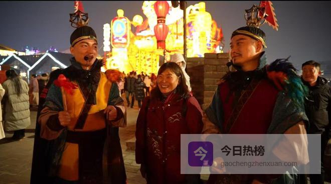 城墙之上,唐风演出轮番上演,是灯会不可错过的“核心体验”。顺着城墙漫步,转角处便能遇上击鼓赐福演出,礼仪官会热情邀请游客共击福鼓,雄浑的鼓声穿越城墙,与护城河上游船的汽笛声交织。