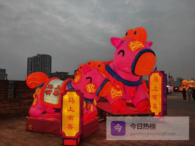 感受灯会,17点后登城墙最为合适。随着暮色逐渐降临,永宁门瓮城的灯光亮起,暗蓝夜空与璀璨灯海同框,随手一拍都是“氛围感大片”。灯组设计融合了50余件国宝文物元素,生肖马元素的花灯与唐诗元素花灯一起,映照得城墙流光溢彩。