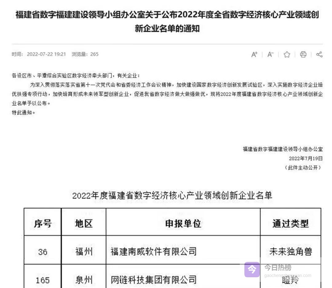 7月22日,福建省数字福建建设领导小组办公室正式公布《2022年度全省数字经济核心产业领域创新企业名单》。福建南威软件有限公司被认定为“未来独角兽企业”,网链科技集团有限公司则跻身“瞪羚企业”序列。两张重量级入场券,标志着南威软件集团在信息技术自主研发与成长潜力两大维度同时登顶,成为福建数字经济赛道最耀眼的“双星”。