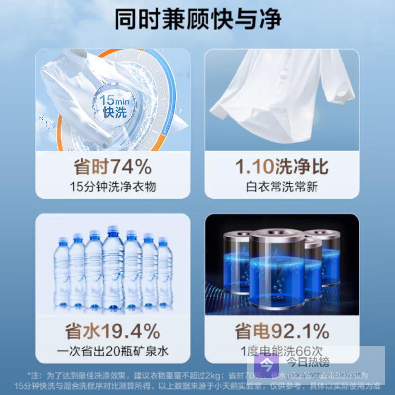通过BLDC变频电机,实现高效节能,节能效率可达92.1%,并且能够在短短15分钟内完成轻薄衣物的快速洗涤。这样省时省电的方案,适合快节奏的生活,让您轻松应对繁忙日常,确保每一次洗涤都能高效完成。