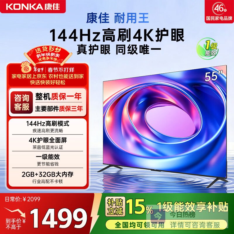 【京东自营】康佳电视55E8AES55英寸游戏电视144Hz高刷护眼4K超清全面屏2+32GB一级能¥