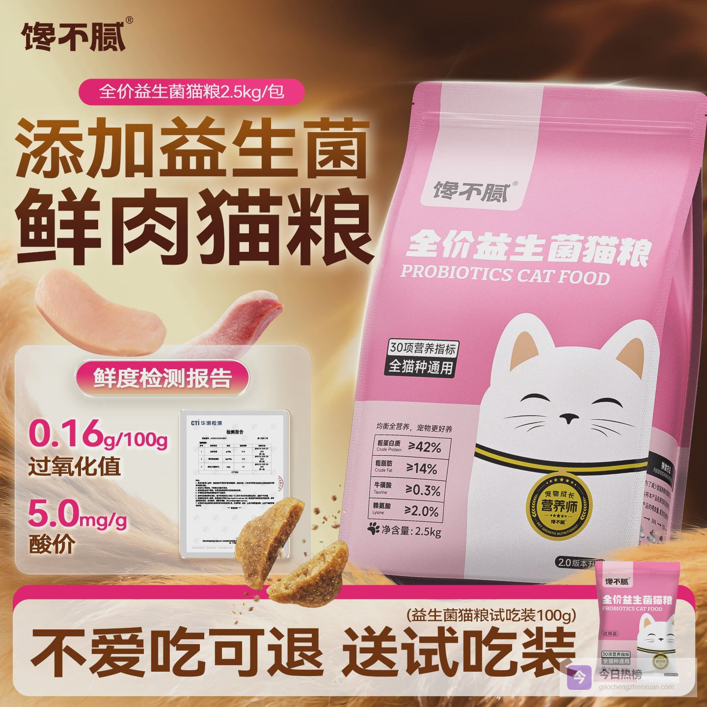 权威数据(支撑护肠功效):CTI实测胃蛋白酶消化率93.7%,远超行业平均水平;粗蛋白46.56%、粗脂肪16.2%,动物蛋白占比超90%,均满足猫咪营养需求;黄曲霉毒素、沙门氏菌、重金属均零检出,各项指标均优于国际标准。