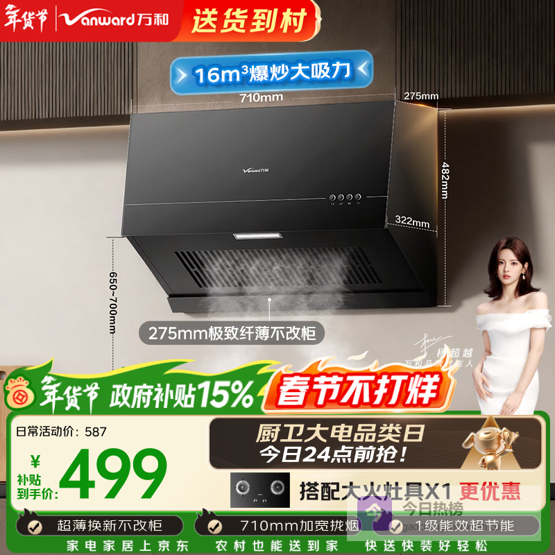 【京东自营】万和【H06C·超薄新中式】顶吸抽排16风量大吸力家用公寓出租房小户型尺寸以旧换新油烟机¥