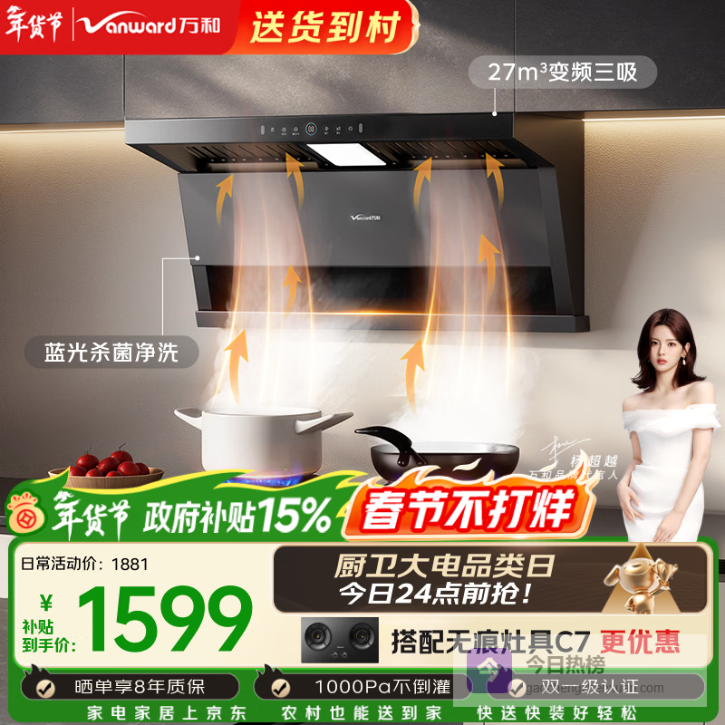 【京东自营】万和【小双翼WL877·蓝光净烟】顶侧双吸抽排27风量变频三吸蓝光杀菌家用大吸力以旧换新¥
