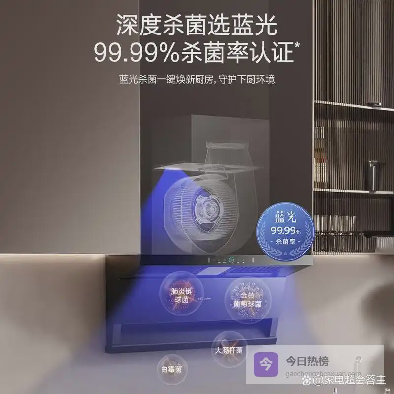 这款油烟机拥有蓝光杀菌技术,可实现高达99.99%的杀菌率,有效去除细菌,保持厨房环境的清新。创新的顶侧三吸设计确保了低位侧吸与顶部双进烟口的无缝配合,无论是炒菜或烧水,都能最大程度避免油烟外泄,保持空气清新。此外,强大的风量表现,如27m3/min的大风量和1000Pa的超高静压,让每次烹饪都能轻松应对。