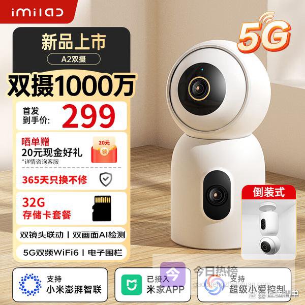 小白接入米家监控摄像头家用监控器360度无死角带夜视全景语音室内家庭手机远程无线高清语音可对话 双摄1000万+5G双频+32G¥