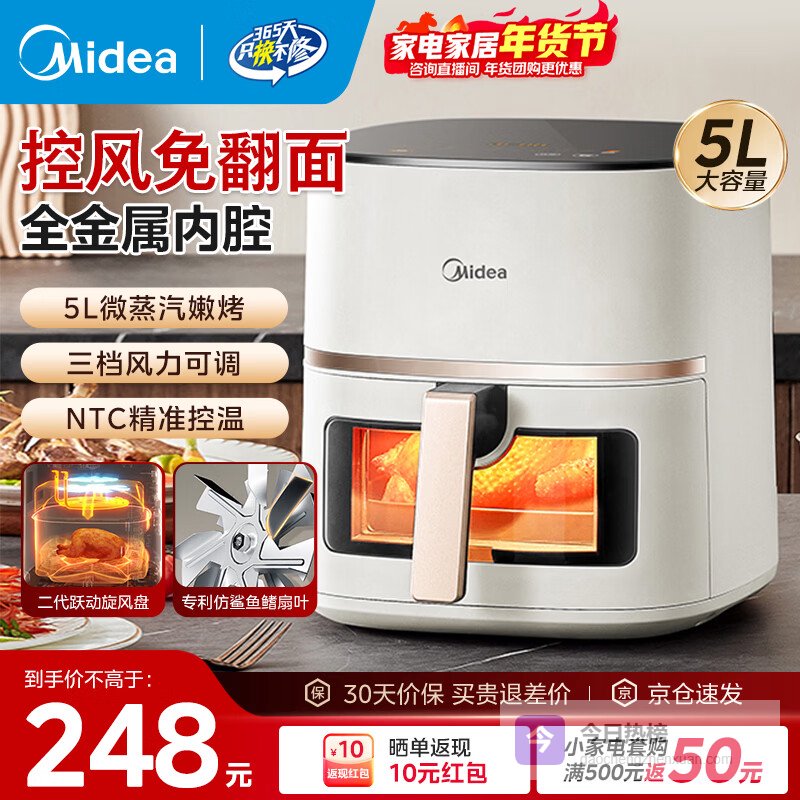 美的(Midea)空气炸锅不用翻面可视大容量家用全自动烤箱多功能不粘易洗触控微蒸汽嫩烤免翻面炸烤一体 KZC5089【风力可调】金属内腔 5L¥