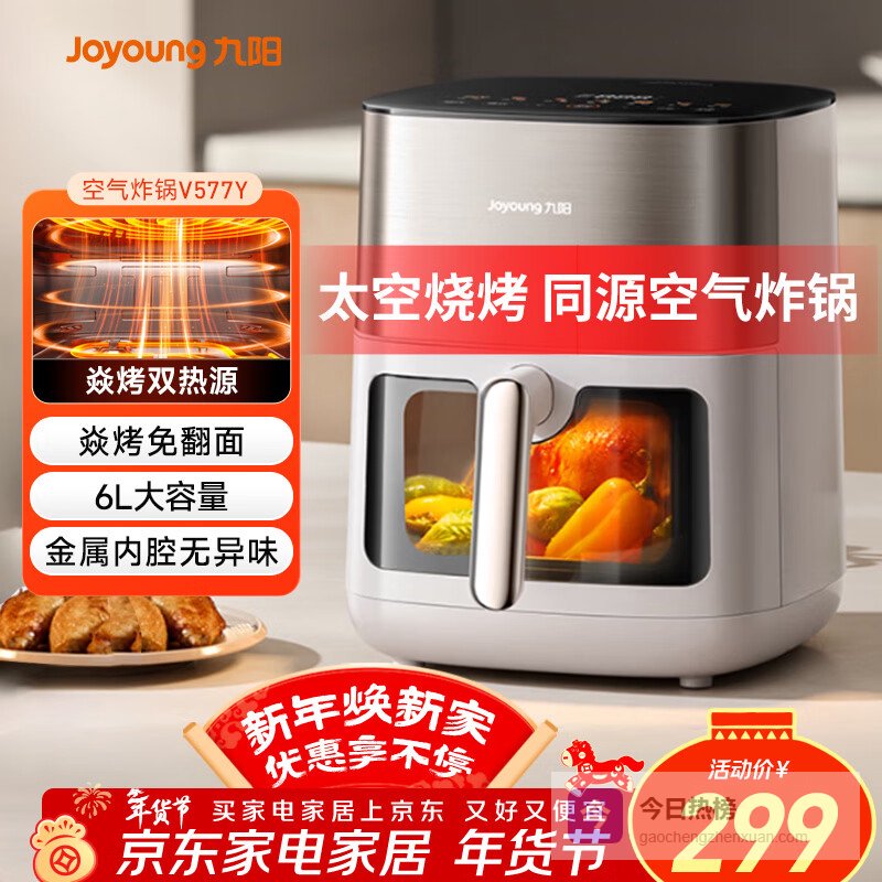 九阳(Joyoung)炎烤空气炸锅 可视大视窗免翻面 上下双热源焱烤 家用智能触控 6L大容量 蒸烤一体机KL60-V577Y¥
