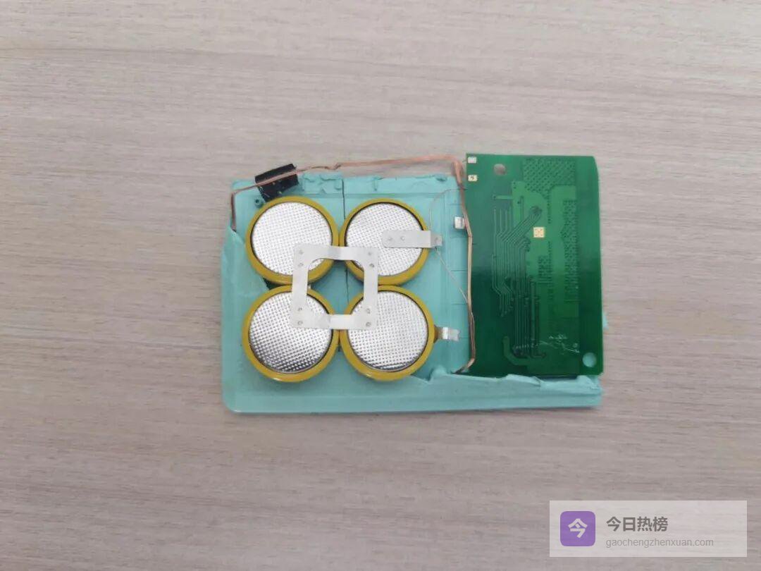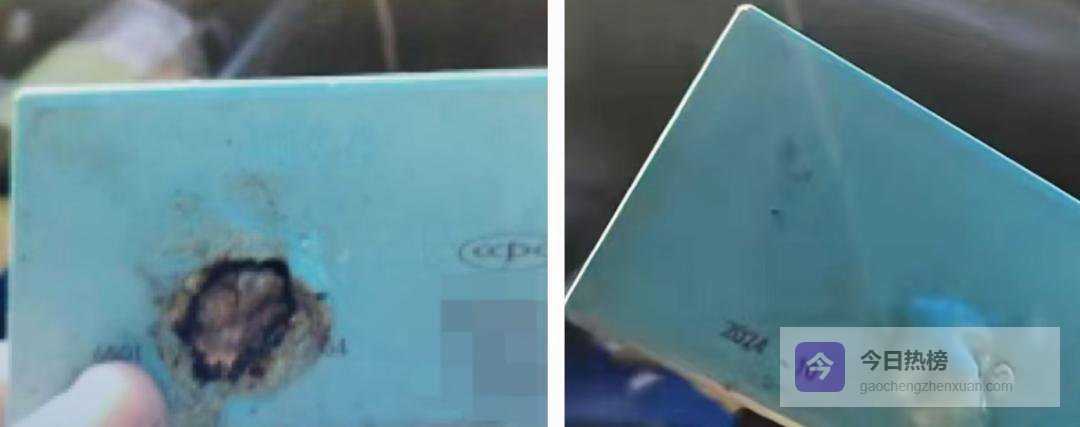 照片显示,卡片一面被烧,形成孔洞,露出了里面的芯片,另一面的塑料外壳则出现了大小不一的鼓包。