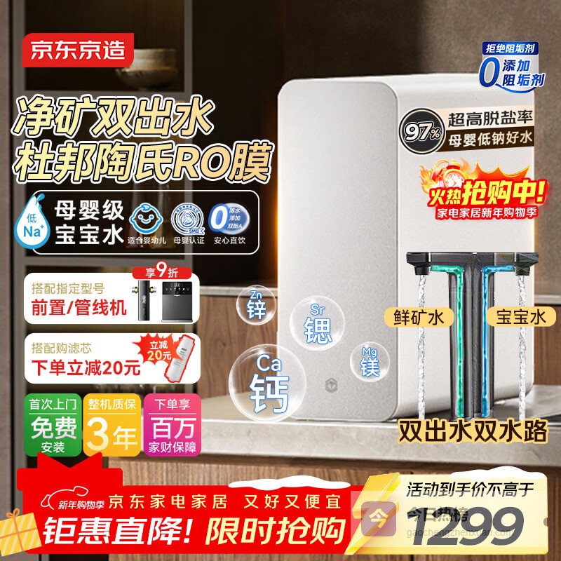 京东京造净水器家用净水机灵犀鲜矿水1000G 净矿双水直饮 6.5年长效陶氏RO反渗透厨下直饮机净饮机¥