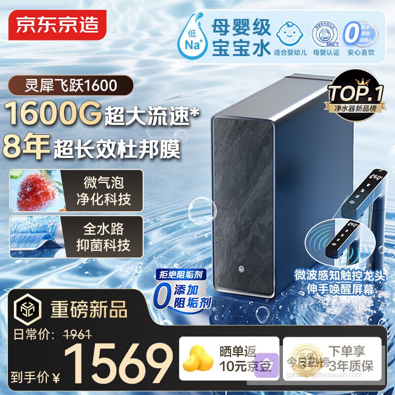 京东京造净水器家用灵犀飞跃1600 0阻垢剂 杜邦陶氏RO母婴反渗透1400G通量初始4.25L/min流速¥