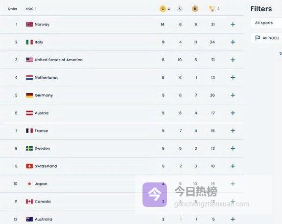 德国、挪威、加拿大、意大利、法国轮番拿金牌,尤其是挪威,14金8银9铜。榜首地位实打实的稳。