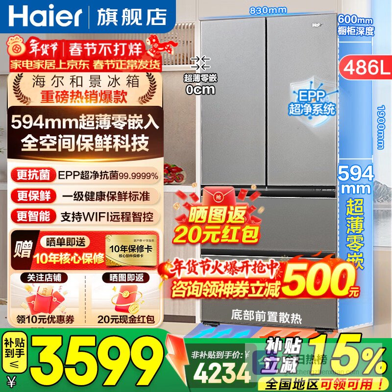 海尔(Haier)冰箱486升594mm专业超薄零嵌入家用法式四开门门多门全空间保鲜风冷无霜一级能效变频电冰箱 594超薄零嵌+全空间保鲜+EPP超净系统¥
